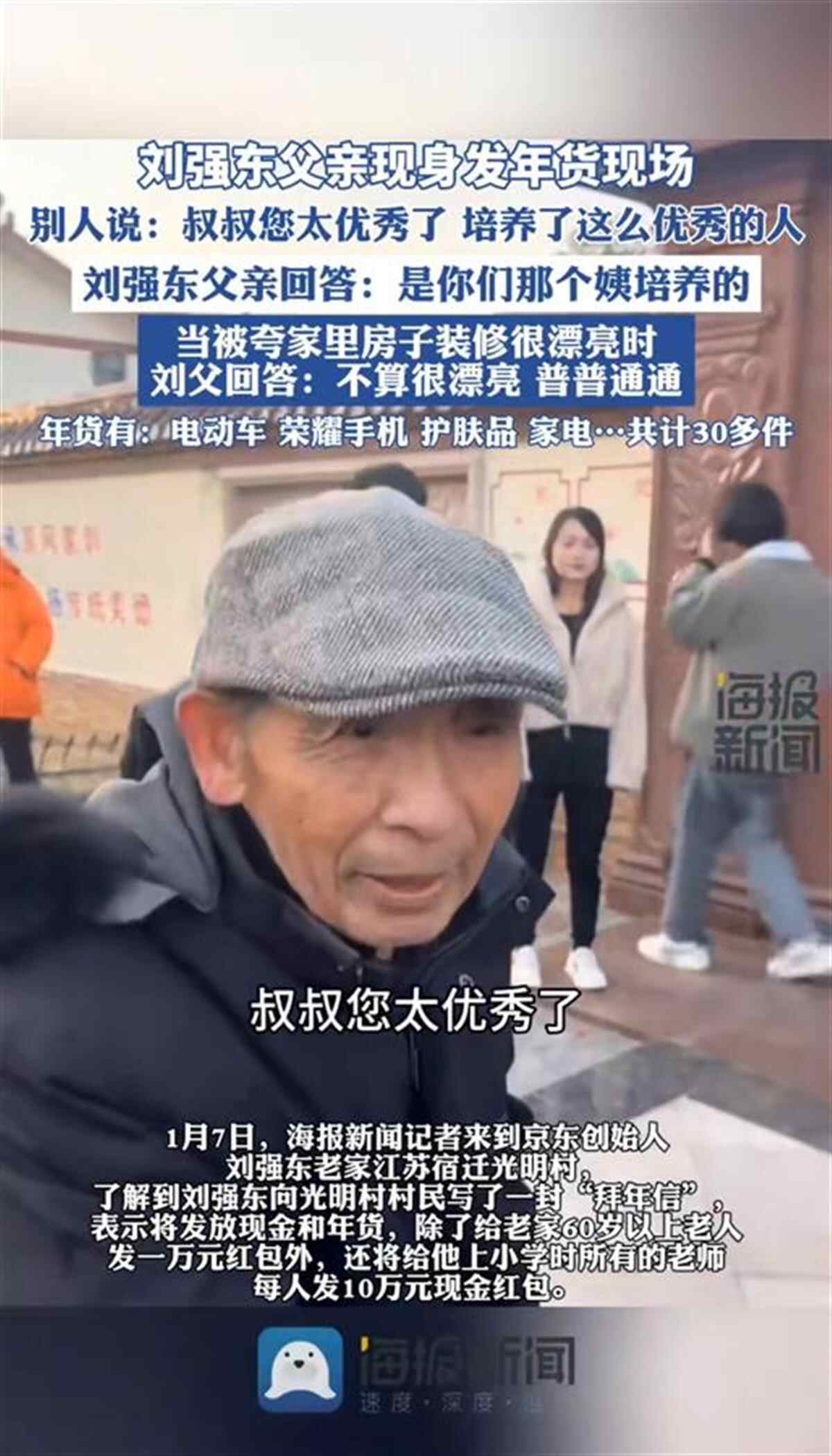 此次发放年货的活动现场,刘强东的父亲也接受了记者采访。刘强东的父亲个子不高,戴一顶贝雷帽,看起来就是一位普通农民。提到自己的儿子,老人显得颇为谦虚:“小孩子为家乡做点贡献是应该的。”