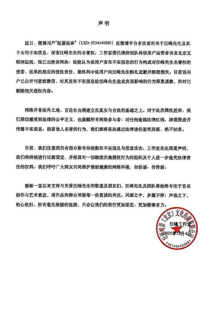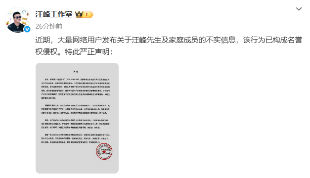 12月4日,@汪峰工作室 发布严正声明:近期,大量网络用户发布关于汪峰先生及家庭成员的不实信息,该行为已构成名誉权侵权。