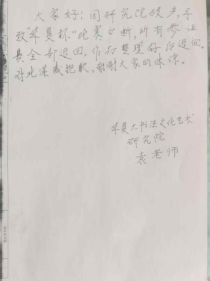 随后,该工作人员又给记者发送了《关于“华夏杯”书法比赛相关问题的致歉声明》,当中提到,书法比赛因合作方突发违约撤离,导致赛事后期组织工作出现严重纰漏,尤其虚构名单问题的出现,严重违背了书法赛事的公平公正原则,也给广大参赛选手带来了诸多困扰与损失。
