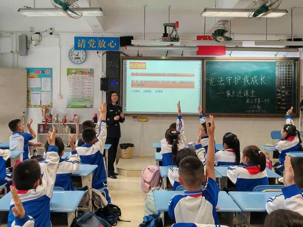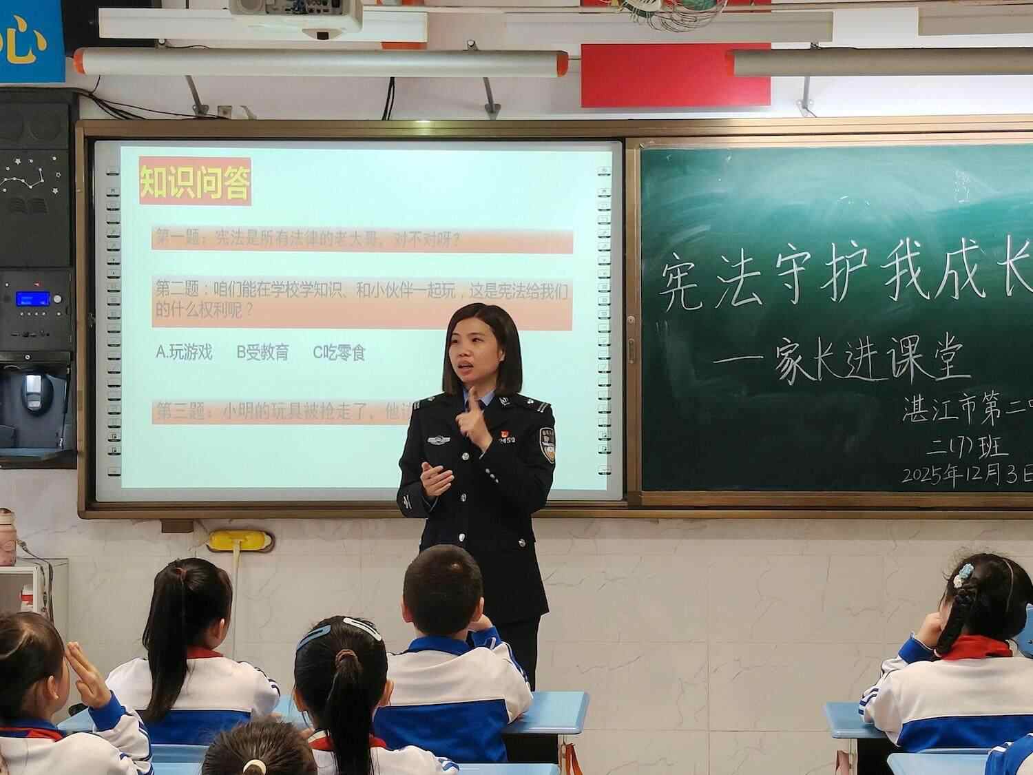 “宪法是所有法律的‘老大哥’,就像超人一样默默守护着大家……”12月4日是“国家宪法日”,近日,一场别开生面的法治课堂在湛江市第二中学小学部进行。湛江边检站民警走进校园,以“宪法守护我成长,做自己的安全小卫士”为主题,让法律的种子在孩子们心中生根发芽。