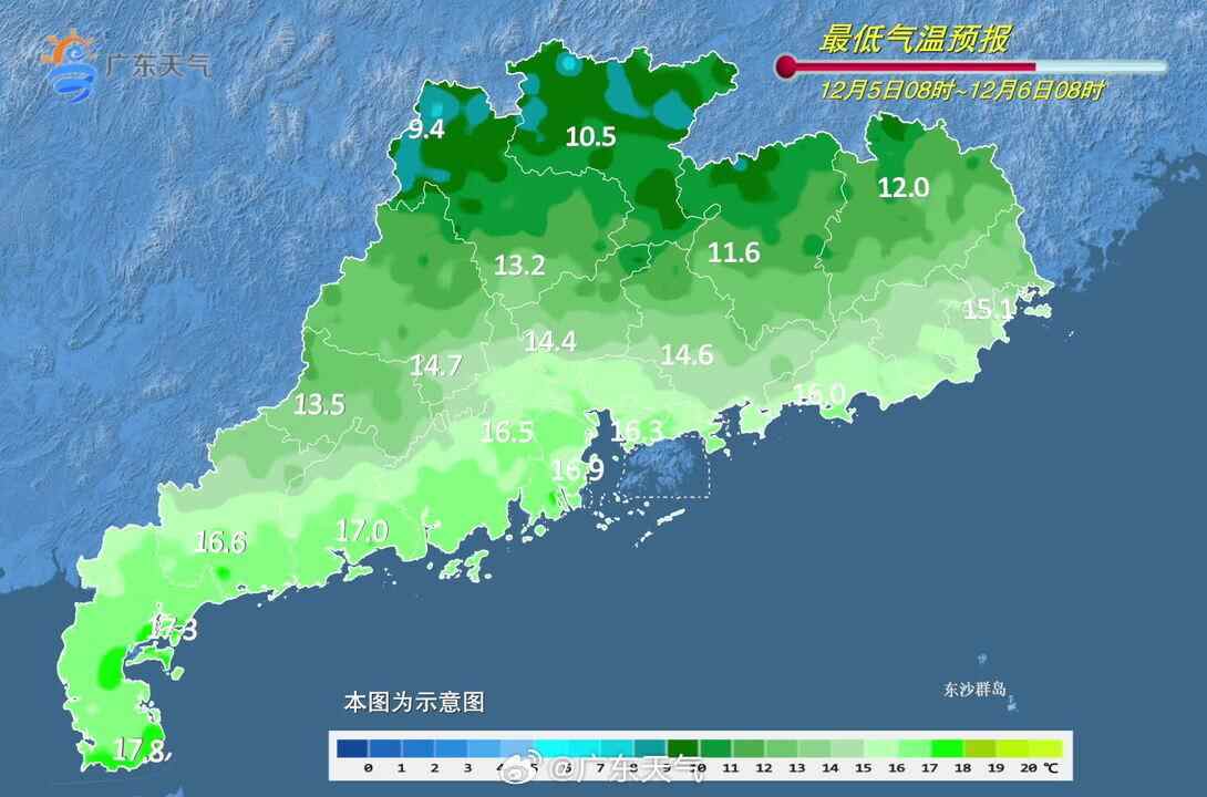 ◆5日,雷州半岛阴天间多云,广东其余市县多云间晴。最低气温:粤北大部、珠三角北部市县8~12℃,粤西17~20℃,其余大部分市县12~15℃。