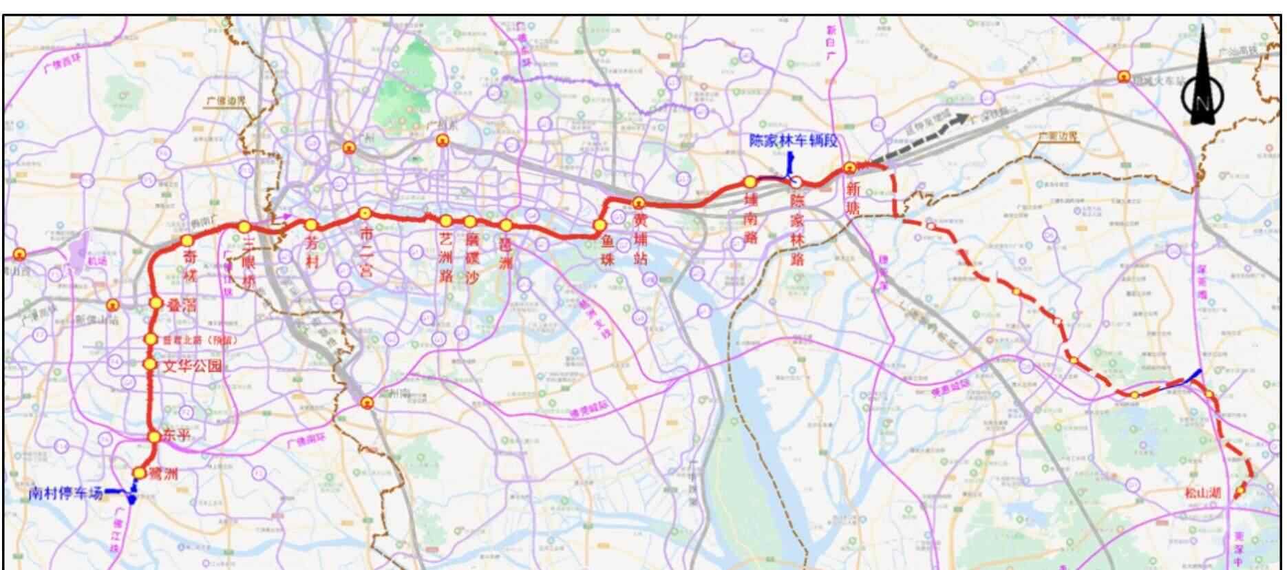 其中广州段共设10座车站,自西往东依次为芳村、市二宫、艺洲路、磨碟沙、琶洲、鱼珠、黄埔站、埔南路、陈家林路、新塘;佛山段共设7站,依次为鹭洲、东平、文华公园、普君北路(预留)、叠滘、奇槎、三眼桥。