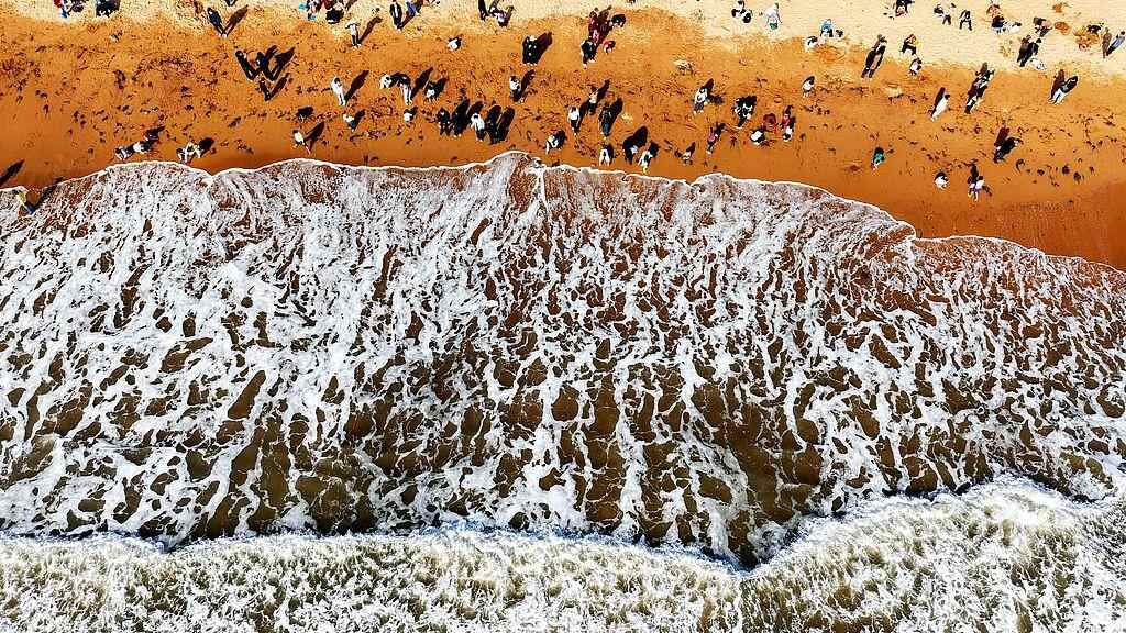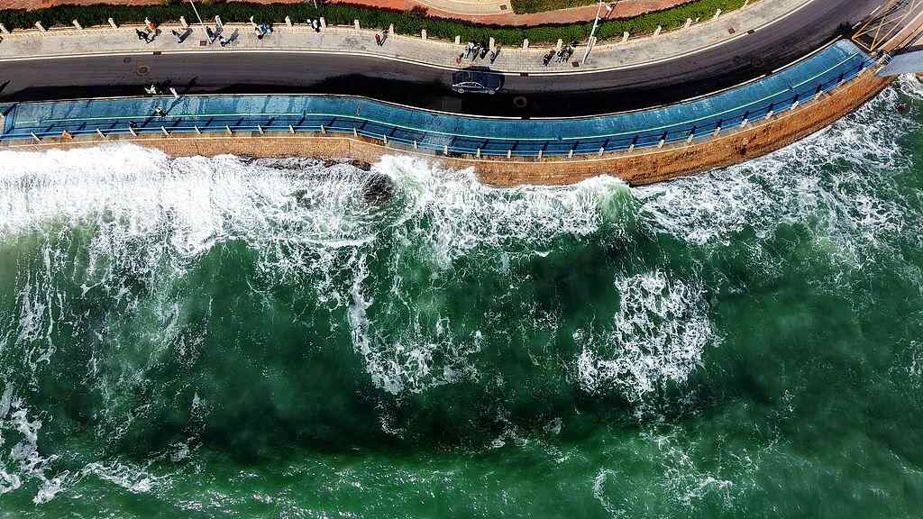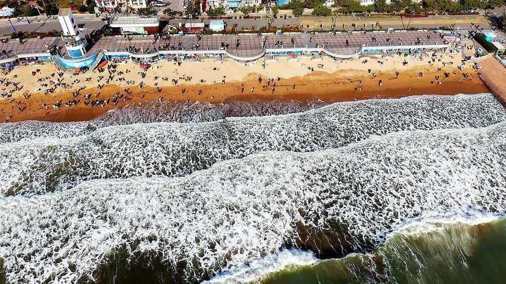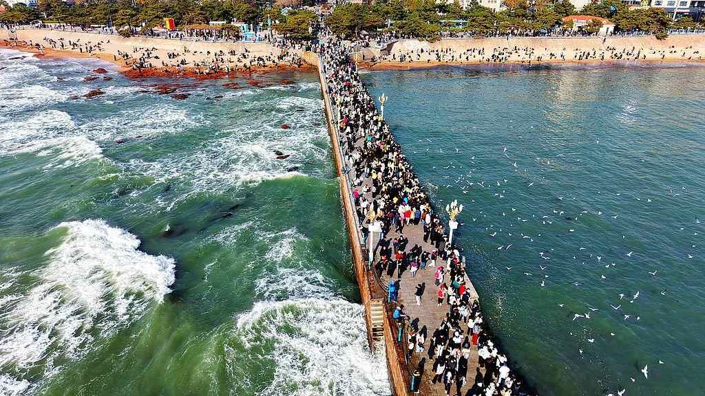 2025年11月29日,受今年第27号台风“天琴”(强热带风暴级)台影响,山东青岛海岸掀起大浪。在栈桥及周边海水浴场,众多游客在观赏海岸美丽景色的同时,又观赏到冬季罕见的壮观海浪。视觉中国