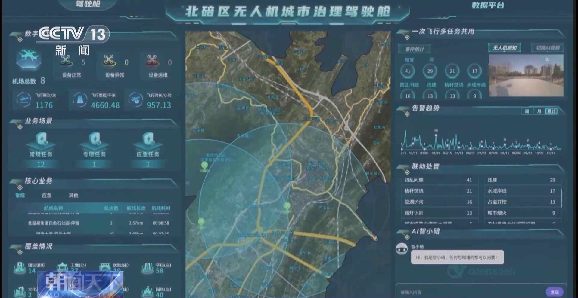 在重庆北碚区,这样的无人机机场一共有5个,可以24小时按照固定航线和固定时间进行巡检,还能“聪明”地自主帮助城市管理者及时发现各类问题。