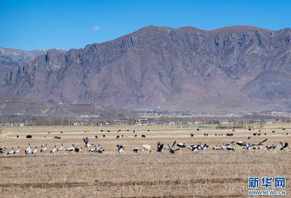 这是11月26日在西藏拉萨市林周县境内拍摄的黑颈鹤和斑头雁。新华网 旦增努布 摄