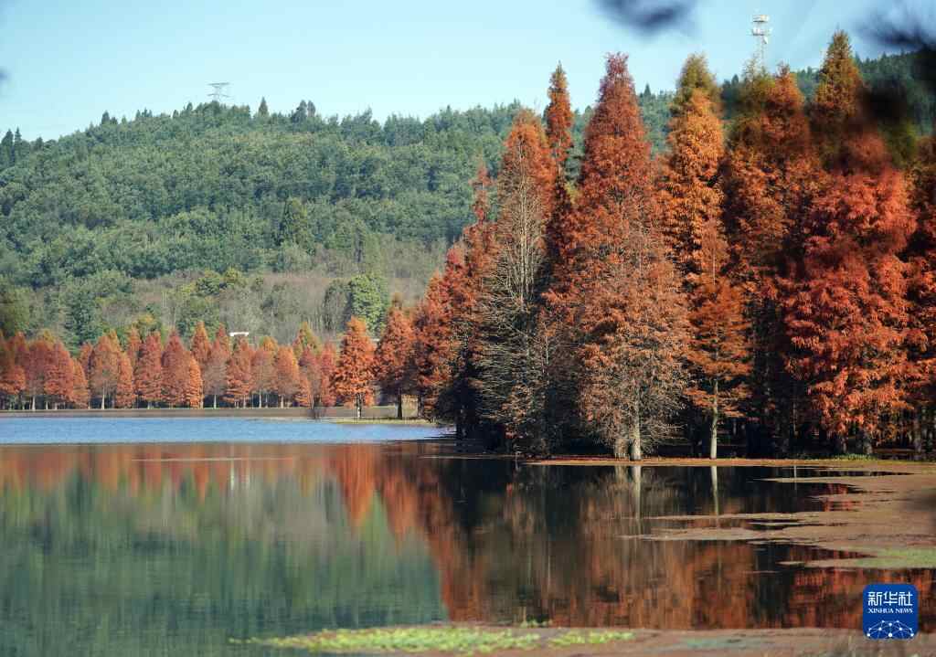 11月28日在云南省昆明市西山区三家村水库拍摄的水杉。