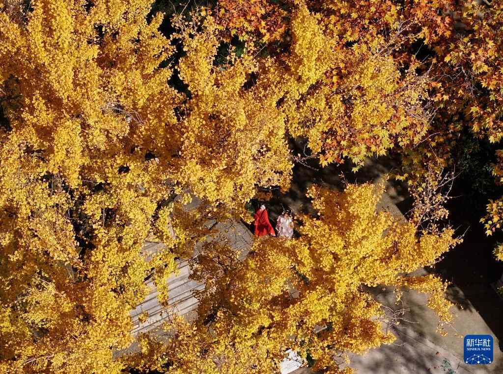 11月28日,游人在湖北省武汉市首义公园银杏树下游玩(无人机照片)。