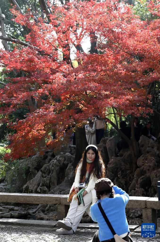 11月28日,游客在江苏苏州拙政园赏景拍照。