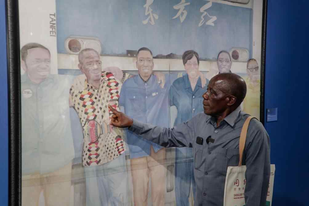 老人抬手指向另一幅画——画中的几个坦桑工人站在“东方红”机车旁,笑容爽朗。姆瓦卡桑加看着画里的人,眼眶微微泛红。这时,又有几位老工人靠了过来,彼此交换着只有他们听得懂的回忆。