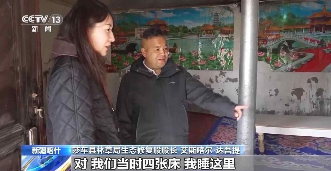 这些年,为了把树种好,艾斯喀尔和林草局的干部们,就用木板和砖块搭起临时棚屋,吃住在沙漠里。