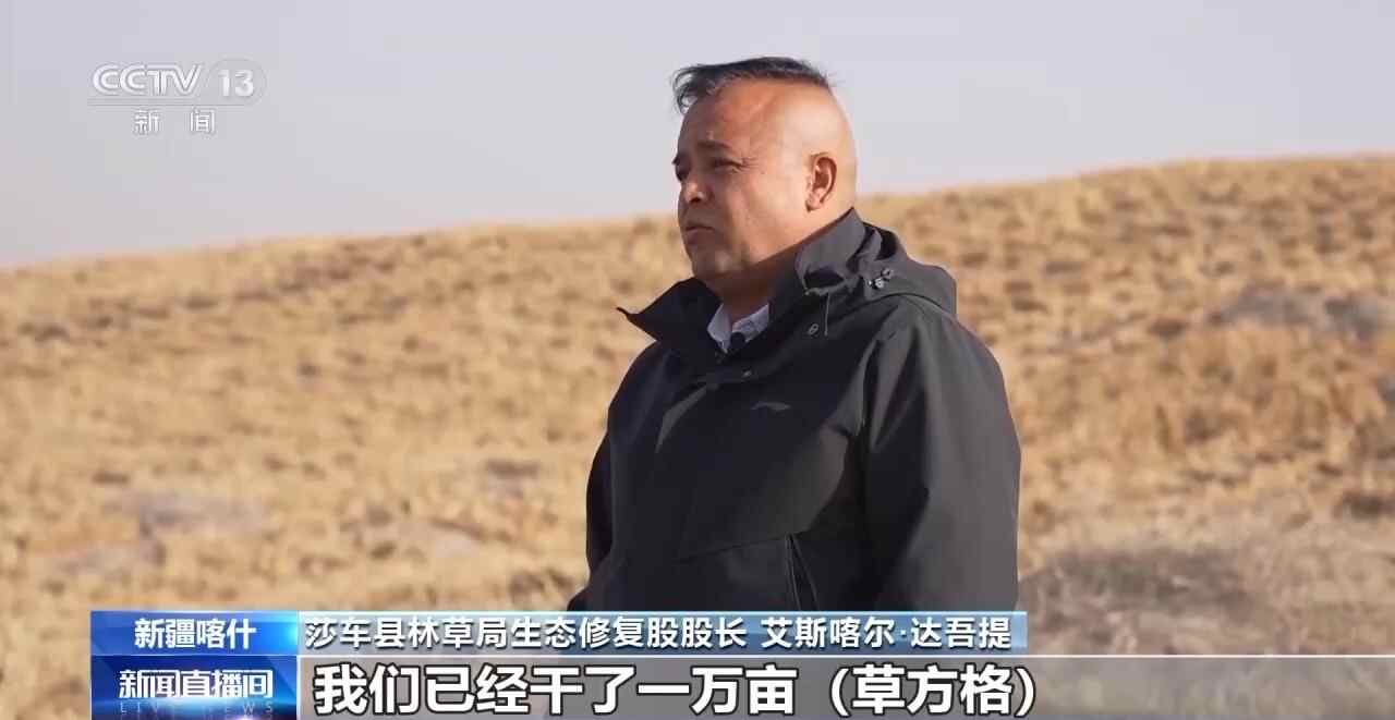 新疆喀什莎车县林草局生态修复股股长 艾斯喀尔·达吾提:我们已经干了一万亩草方格,去年干了三千亩,我们这块48公里的长度,南连叶城县交界,北连麦盖提县交界,我们都已经连上了。今年的任务是7000亩,因为只有草方格能把流动沙丘能挡住。