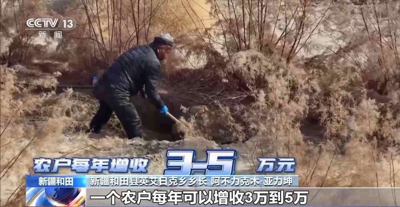 新疆和田县英艾日克乡乡长 阿不力克木·亚力坤:目前我们英艾日克乡已种植肉苁蓉面积达到2.29万亩,一个农户每年可以增收3万元到5万元。