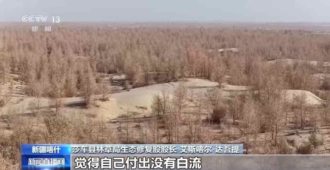 新疆喀什莎车县林草局生态修复股股长 艾斯喀尔·达吾提:当时想着先保护绿洲,不要让农田被沙漠侵蚀。当时想第一步,先从最大的沙漠开始,然后再逐步向布古里沙漠。