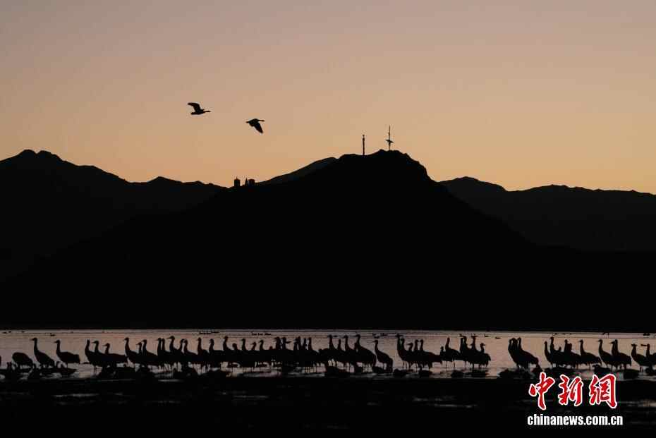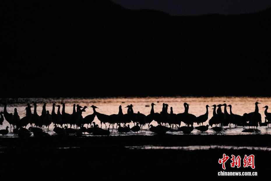 11月26日,位于西藏自治区拉萨市林周县黑颈鹤自然保护区内,大批越冬黑颈鹤现身卡孜水库及田间地头,悠闲觅食、嬉戏。这些远道而来的黑颈鹤,将在此栖息至次年三四月份。黑颈鹤为中国国家一级保护动物,也是唯一在高原生活、繁殖的鹤类。近年来,随着当地生态保护力度持续加大,前往林周县越冬的黑颈鹤等候鸟数量逐年增多。图为在林周县卡孜水库拍摄的黑颈鹤。