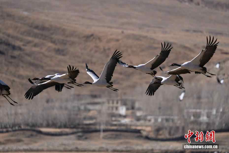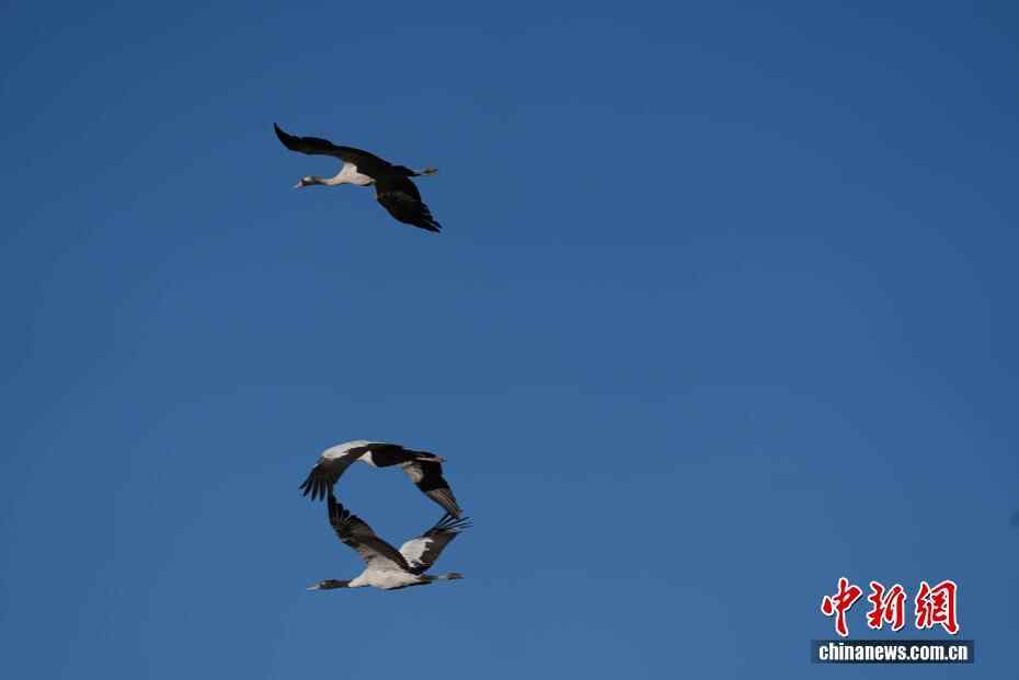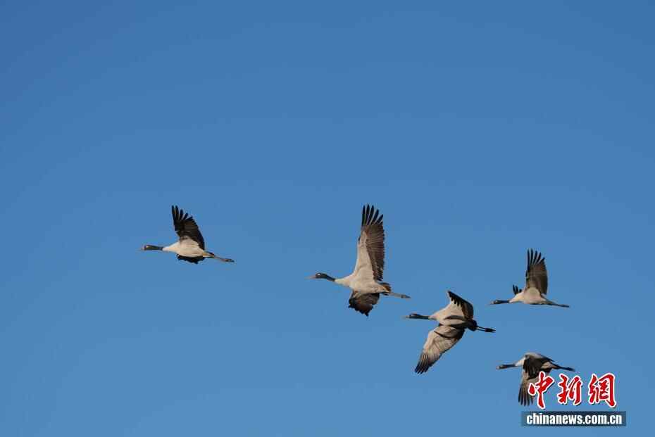11月26日,位于西藏自治区拉萨市林周县黑颈鹤自然保护区内,大批越冬黑颈鹤现身卡孜水库及田间地头,悠闲觅食、嬉戏。这些远道而来的黑颈鹤,将在此栖息至次年三四月份。黑颈鹤为中国国家一级保护动物,也是唯一在高原生活、繁殖的鹤类。近年来,随着当地生态保护力度持续加大,前往林周县越冬的黑颈鹤等候鸟数量逐年增多。图为黑颈鹤在林周县黑颈鹤保护区内飞翔。