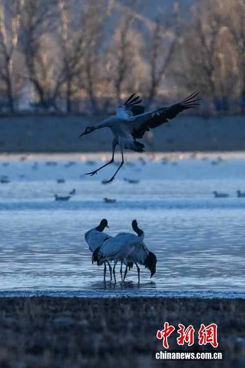 11月26日,位于西藏自治区拉萨市林周县黑颈鹤自然保护区内,大批越冬黑颈鹤现身卡孜水库及田间地头,悠闲觅食、嬉戏。这些远道而来的黑颈鹤,将在此栖息至次年三四月份。黑颈鹤为中国国家一级保护动物,也是唯一在高原生活、繁殖的鹤类。近年来,随着当地生态保护力度持续加大,前往林周县越冬的黑颈鹤等候鸟数量逐年增多。图为黑颈鹤在林周县境内的农田里觅食、嬉戏。