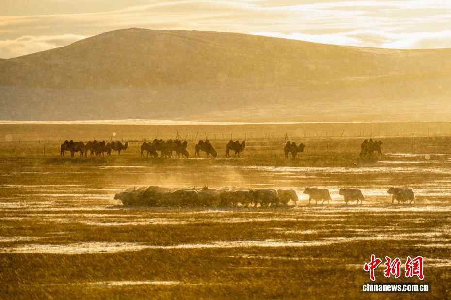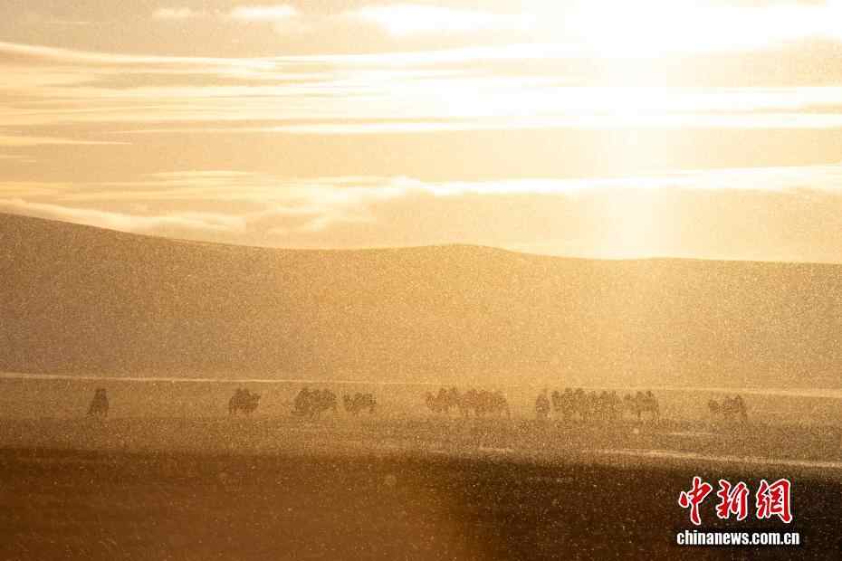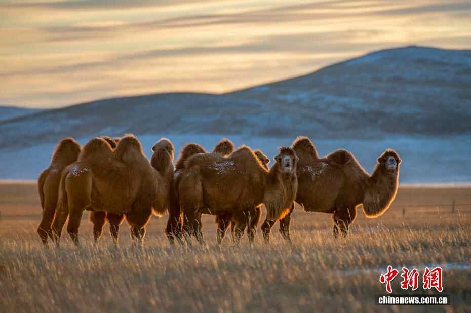 近日,内蒙古自治区锡林郭勒盟锡林浩特迎来入冬后的首场降雪。落日时分,余晖洒落,漫天雪花如碎金般飞舞,茫茫草原覆上一层薄白。骆驼群沉稳徜徉,牦牛群悠闲食草。夕阳中,它们的身影被镀上一层温暖金边。图为夕阳下的驼群。