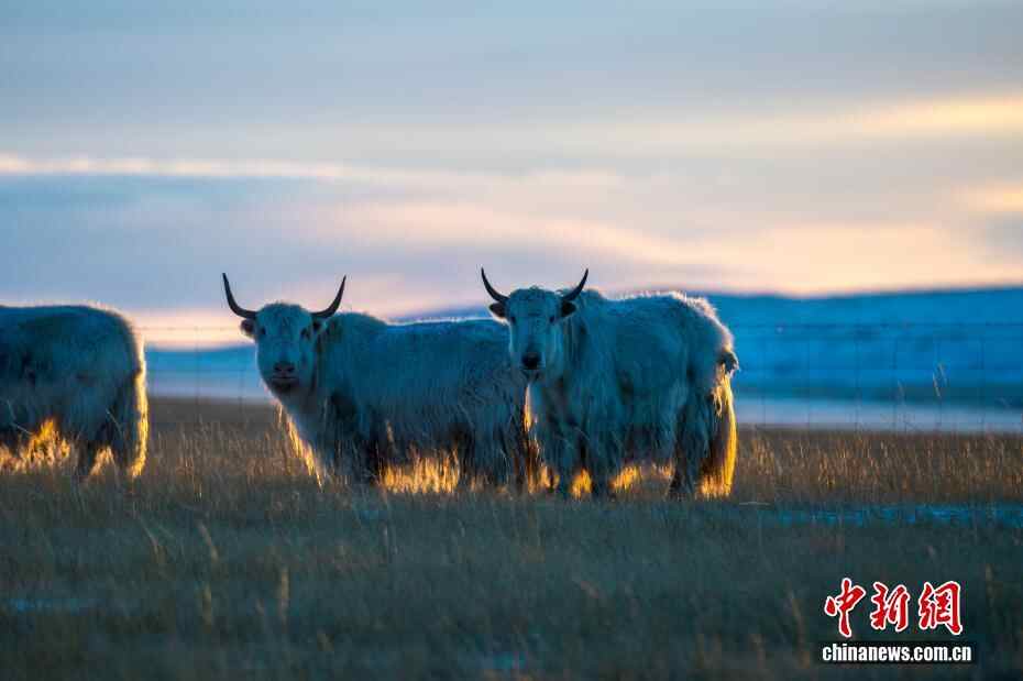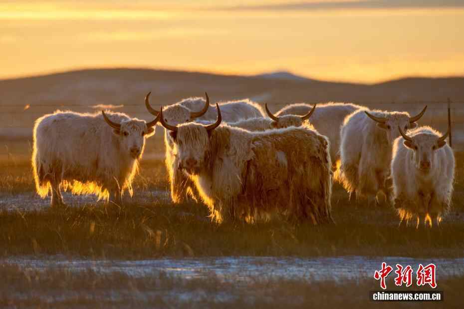 近日,内蒙古自治区锡林郭勒盟锡林浩特迎来入冬后的首场降雪。落日时分,余晖洒落,漫天雪花如碎金般飞舞,茫茫草原覆上一层薄白。骆驼群沉稳徜徉,牦牛群悠闲食草。夕阳中,它们的身影被镀上一层温暖金边。图为牦牛被夕阳“镶”上金边。