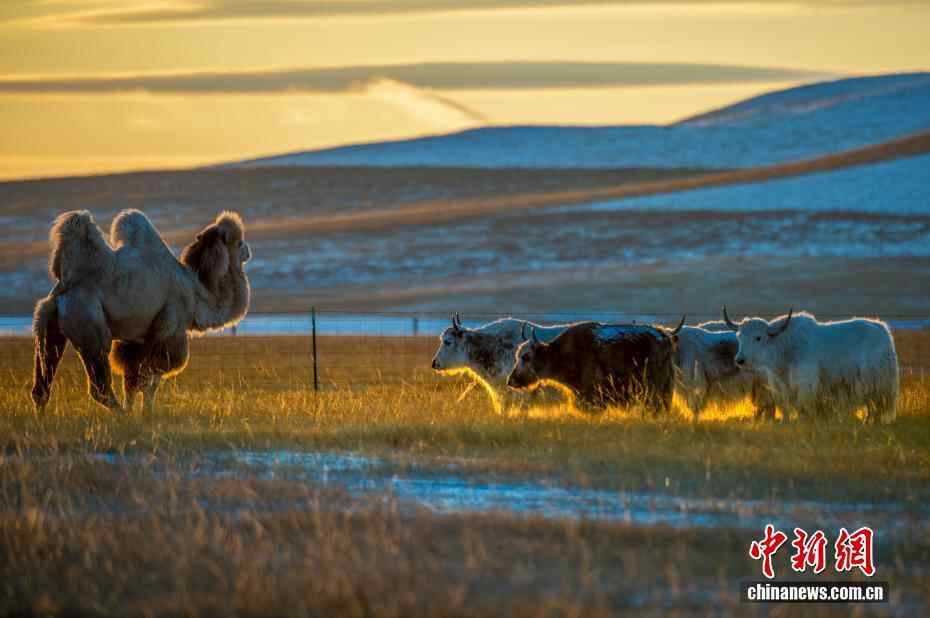 近日,内蒙古自治区锡林郭勒盟锡林浩特迎来入冬后的首场降雪。落日时分,余晖洒落,漫天雪花如碎金般飞舞,茫茫草原覆上一层薄白。骆驼群沉稳徜徉,牦牛群悠闲食草。夕阳中,它们的身影被镀上一层温暖金边。图为闲适的骆驼和牦牛。
