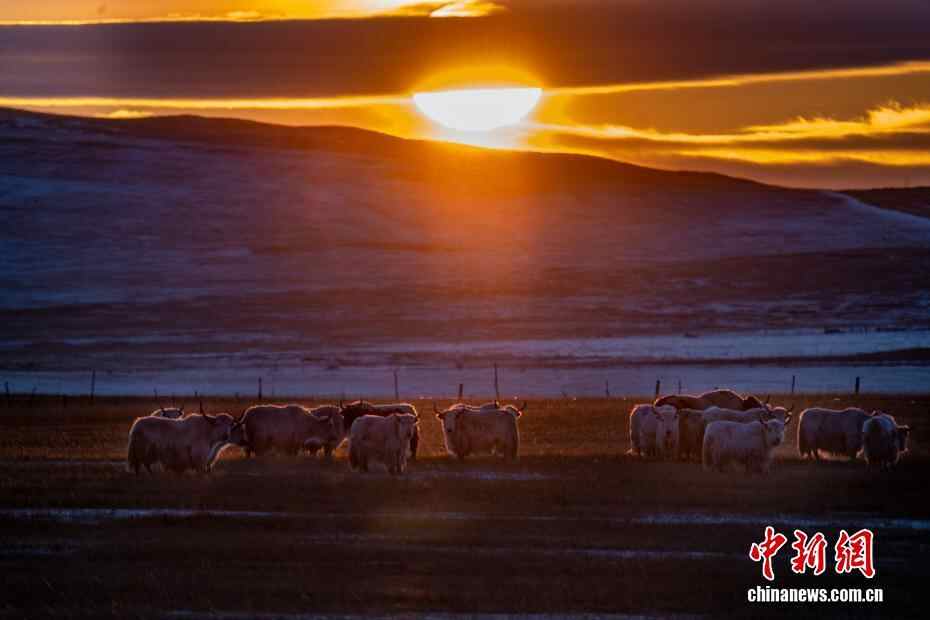 近日,内蒙古自治区锡林郭勒盟锡林浩特迎来入冬后的首场降雪。落日时分,余晖洒落,漫天雪花如碎金般飞舞,茫茫草原覆上一层薄白。骆驼群沉稳徜徉,牦牛群悠闲食草。夕阳中,它们的身影被镀上一层温暖金边。图为晚霞中的牦牛群。