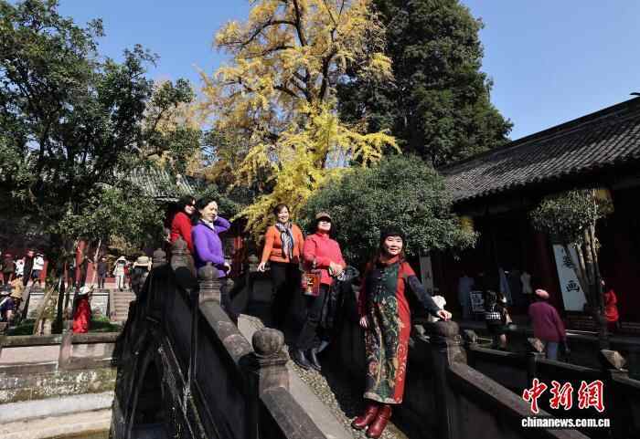 11月27日,初冬暖阳下的四川省崇州市罨画池博物馆,凭借青瓦红墙与金色银杏的组合,吸引游客和市民争相前来打卡拍照。图为几名游人在罨画池的拱桥上拍照留影。中新社记者 王磊 摄
