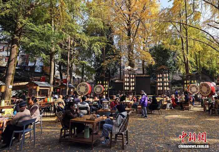 11月27日,初冬暖阳下的四川省崇州市罨画池博物馆,凭借青瓦红墙与金色银杏的组合,吸引游客和市民争相前来打卡拍照。图为游人在罨画池的茶园里休闲喝茶。中新社记者 王磊 摄