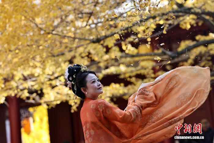 11月27日,初冬暖阳下的四川省崇州市罨画池博物馆,凭借青瓦红墙与金色银杏的组合,吸引游客和市民争相前来打卡拍照。图为一位身着传统服饰的女士在银杏树下拍摄美照。中新社记者 王磊 摄