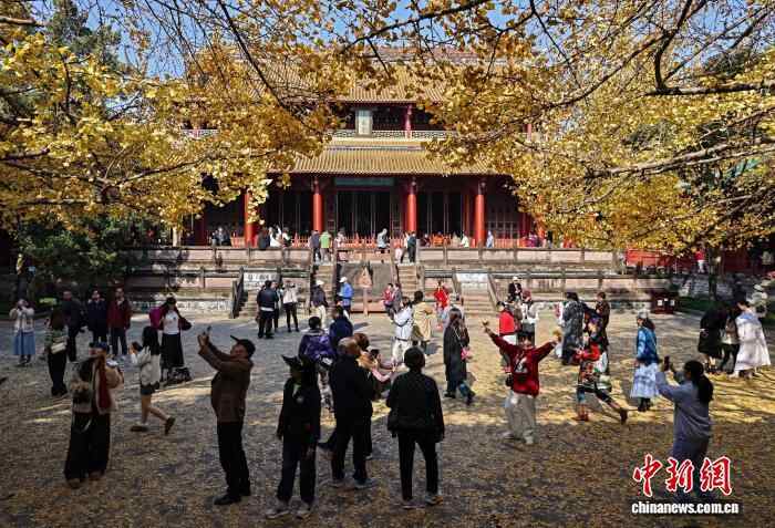 11月27日,初冬暖阳下的四川省崇州市罨画池博物馆,凭借青瓦红墙与金色银杏的组合,吸引游客和市民争相前来打卡拍照。图为游人在银杏树下打卡拍照。中新社记者 王磊 摄