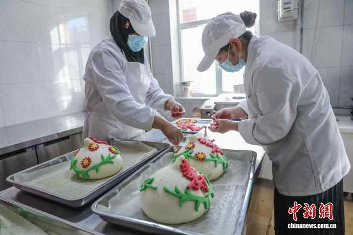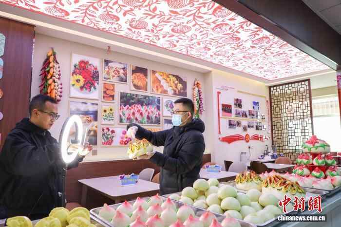 11月27日,西宁市林家崖街道“东城·共富工坊”村级产销社内,面点师制作特色面点“福禄寿桃”。中新社记者 马铭言 摄