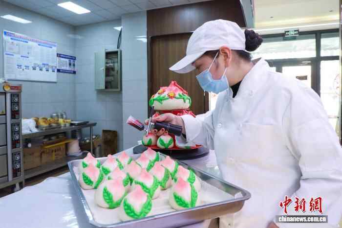 11月27日,西宁市林家崖街道“东城·共富工坊”村级产销社内,面点师为“福禄寿桃”喷洒天然果蔬汁。中新社记者 马铭言 摄