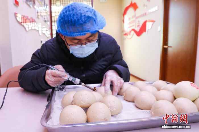 11月27日,西宁市林家崖街道“东城·共富工坊”村级产销社内,工人在杂粮馒头上拓印雪豹图案。中新社记者 马铭言 摄