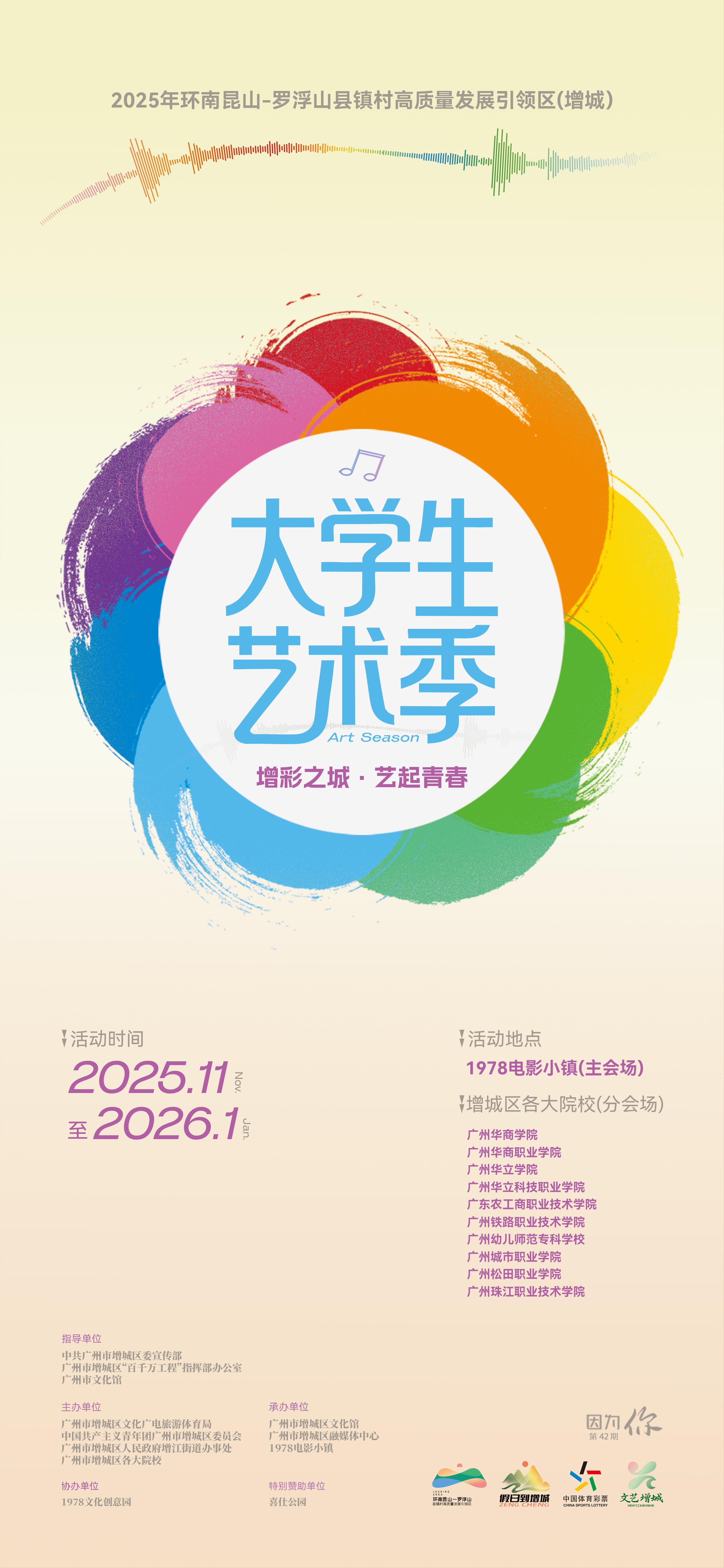 金羊网讯 冬日广州增城,依旧洋溢着蓬勃的朝气。2025年环南昆山—罗浮山引领区(增城)“增彩之城·艺起青春”大学生艺术季将于11月28日晚在增城正式拉开帷幕,将持续至2026年1月,深入贯彻省、市、区“百千万工程”战略部署,以文化力量赋能区域高质量发展,激发青年创造活力。
