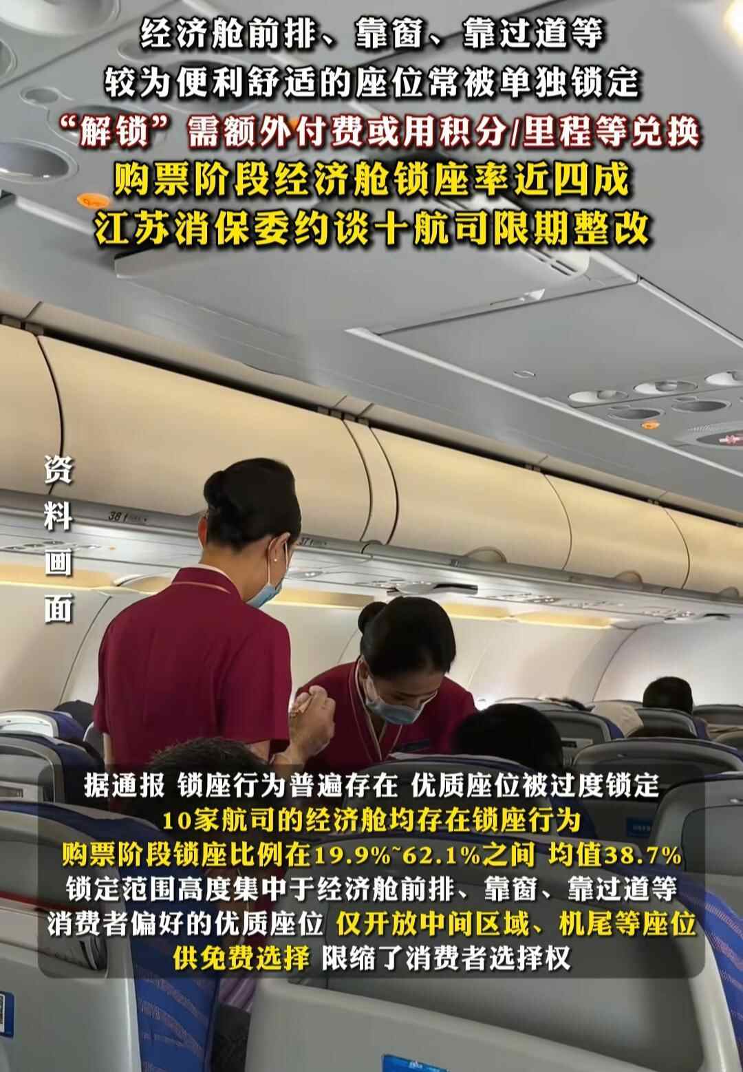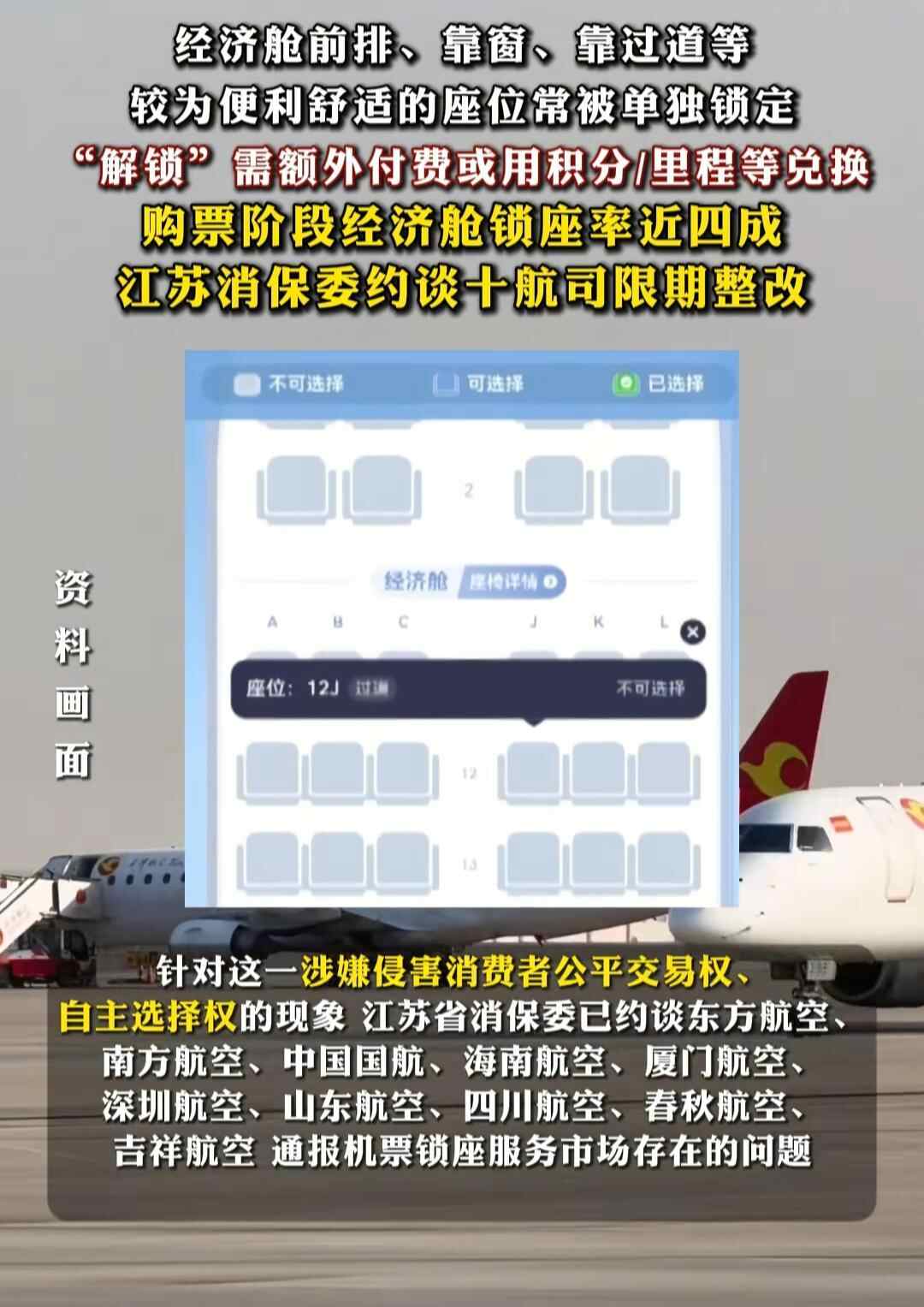 江苏消保委在约谈中明确指出,航空运输作为兼具公共服务属性与市场化运营特点的行业,机票价格已涵盖经济舱座位的基础使用权,航司将普通座位人为分级并变相收费,本质上是拆分基础服务、重复收费的“变相割韭菜”行为,严重侵犯了消费者的公平交易权与自主选择权。消保委要求10家被约谈航司在15个工作日内提交书面整改方案,核心整改方向包括缩减锁座范围、仅保留特殊旅客预留等必要场景锁座、取消变相付费选座、公示收费依据、修订不公平格式条款等。