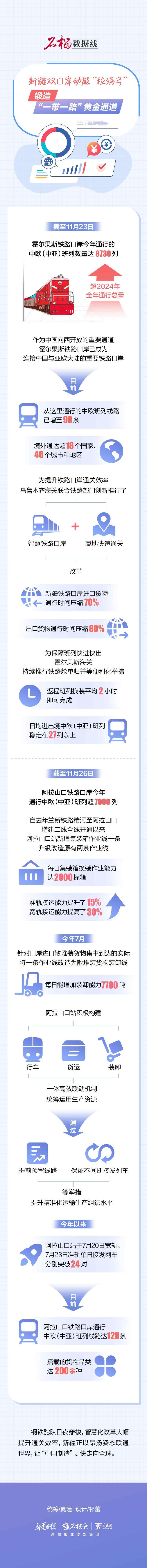 截至11月23日,霍尔果斯铁路口岸今年通行的中欧(中亚)班列数量达8730列,超2024年全年通行总量。