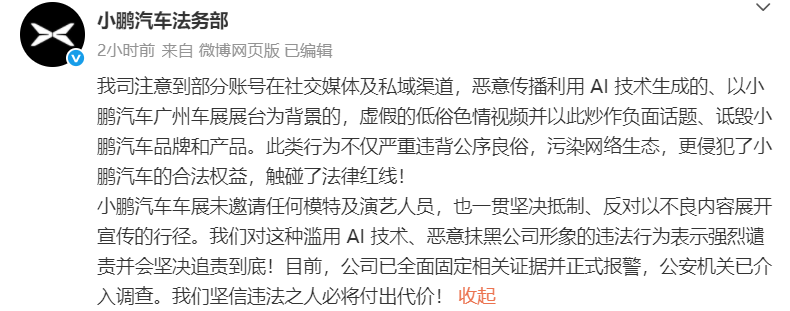 我司注意到部分账号在社交媒体及私域渠道,恶意传播利用AI技术生成的、以小鹏汽车广州车展展台为背景的,虚假的低俗色情视频并以此炒作负面话题、诋毁小鹏汽车品牌和产品。此类行为不仅严重违背公序良俗,污染网络生态,更侵犯了小鹏汽车的合法权益,触碰了法律红线!