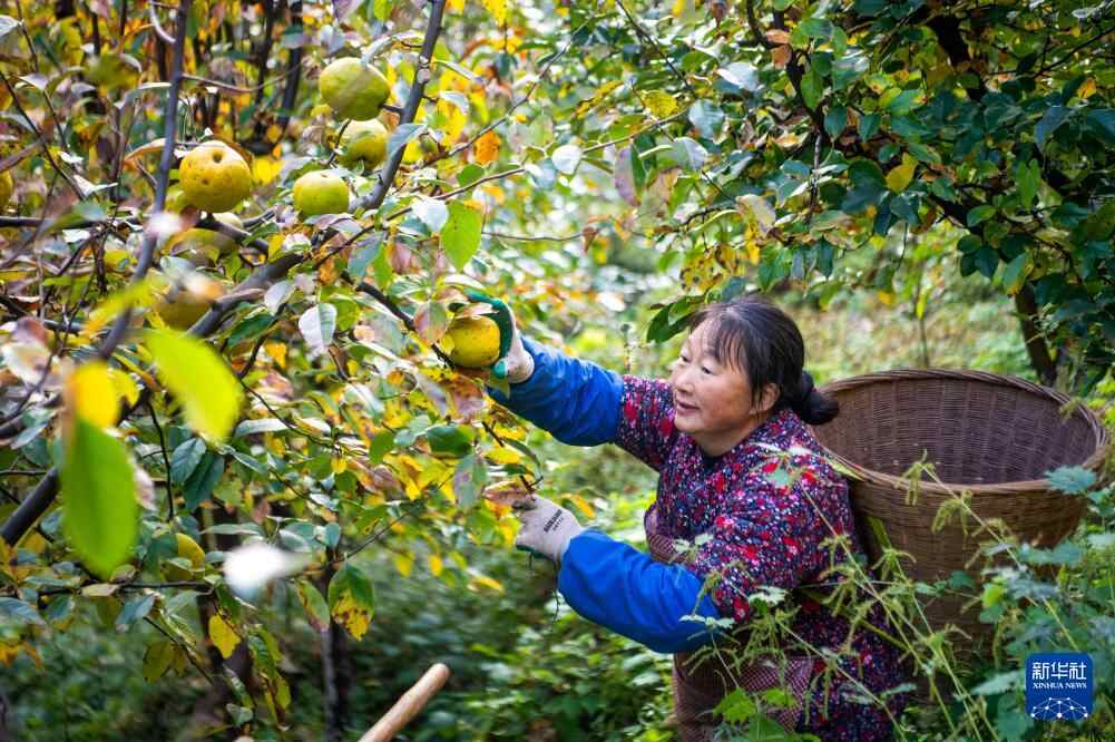 11月21日,重庆市石柱县中益乡的农民在木瓜地里采收木瓜。