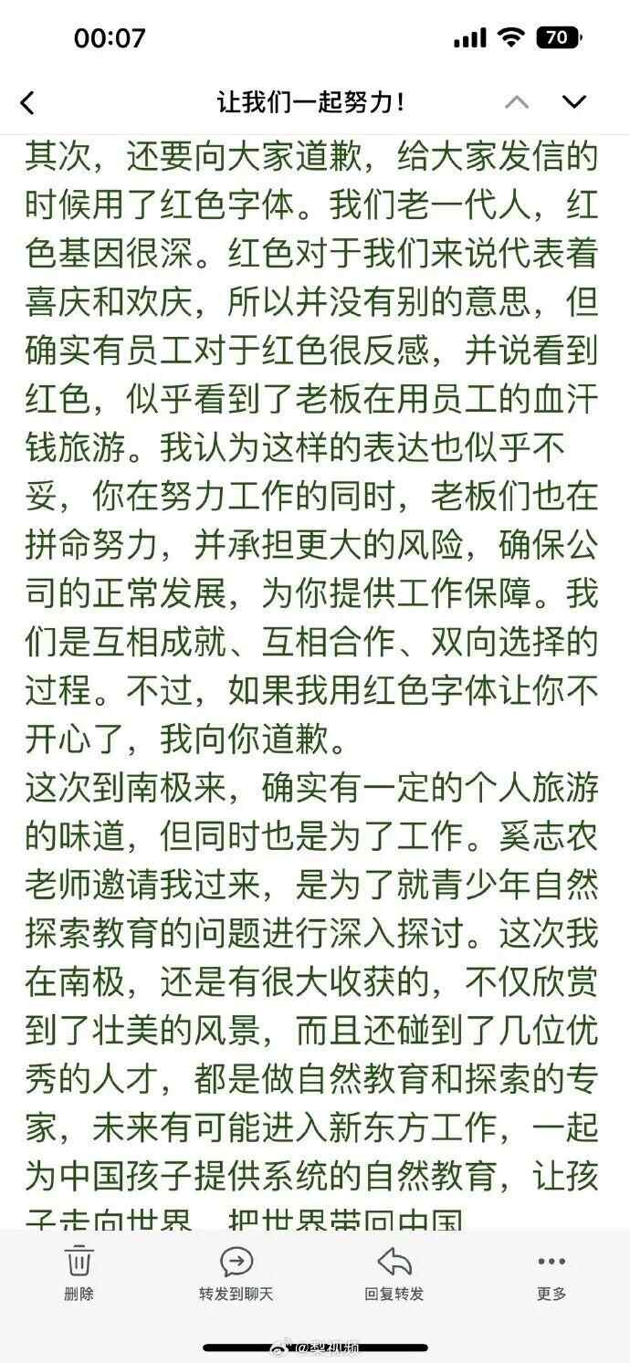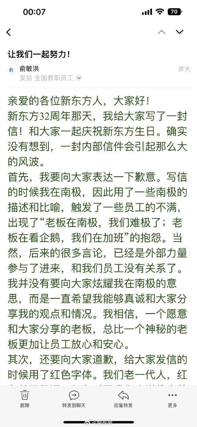 俞敏洪首先向员工表达了歉意,写信时在南极,因此用了一些南极的描述和比喻,触发了一些员工的不满,并没有要向大家炫耀在南极的意思,而是一直希望能够真诚和大家分享我的观点和情况。“一个愿意和大家分享的老板,总比一个神秘的老板更加让员工放心和安心。”