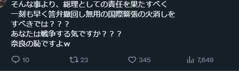 帖文大意:因为你的发言,中国限制了日本商品进口、不鼓励赴日出行,请承担责任。