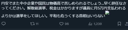 帖文大意:日元贬值将让中小企业和民众再次饱受物价上涨之苦……(高市)尽快辞职。
