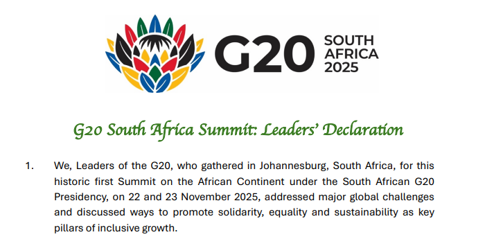 二十国集团(G20)领导人第二十次峰会当地时间11月22日在南非约翰内斯堡开幕。南非国际关系与合作部长罗纳德•拉莫拉在当天下午召开的记者发布会上表示,与会各方已就会议核心议程达成共识,并通过了《二十国集团领导人约翰内斯堡峰会宣言》。