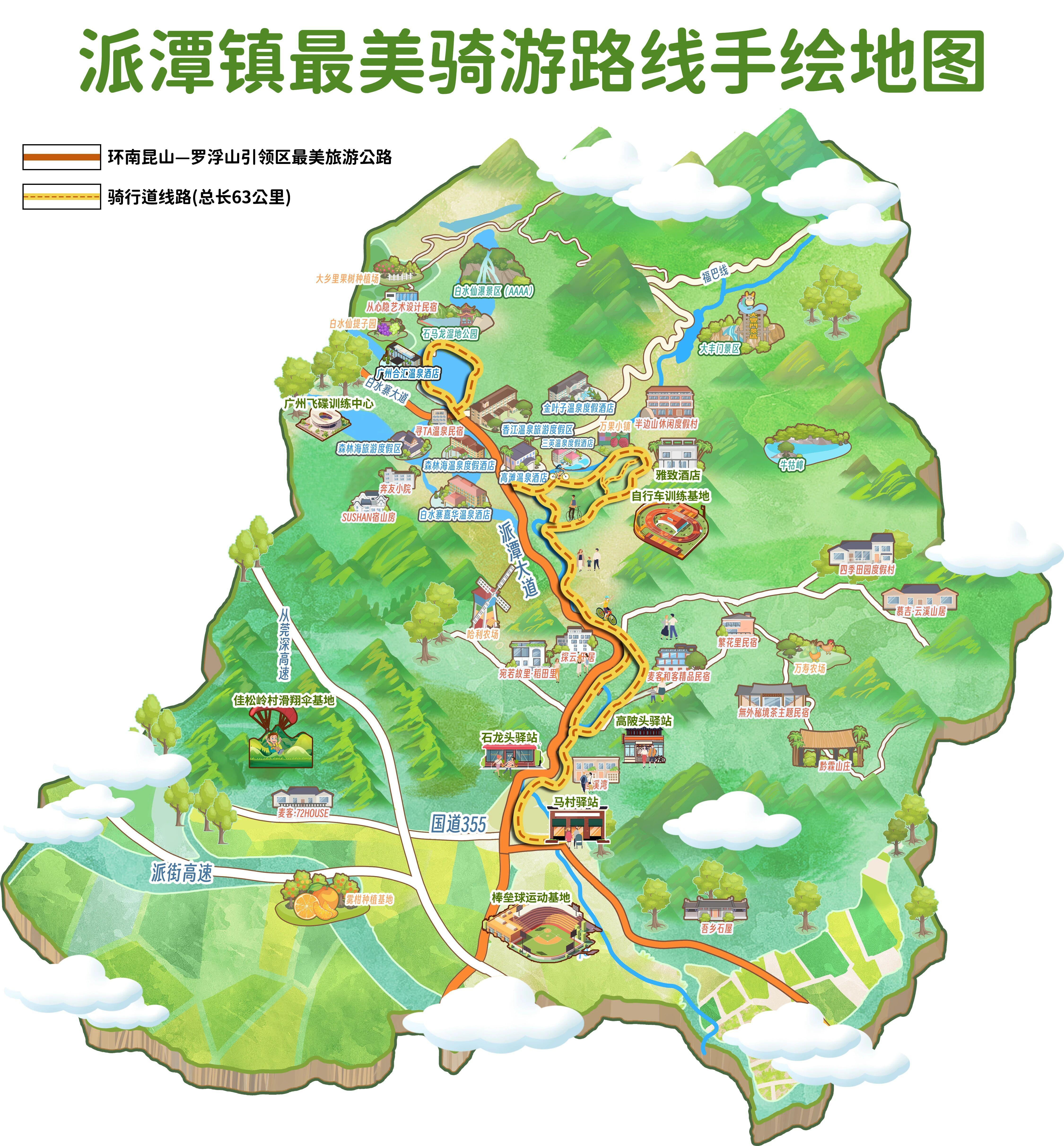 活动现场,《派潭镇最美骑游路线手绘地图》正式发布,成为全场焦点。该地图以“一河两岸三片区”为核心,全景呈现派潭镇63公里全域骑行网络,系统构建“生态串联—功能配套—场景融合”的骑游体系。