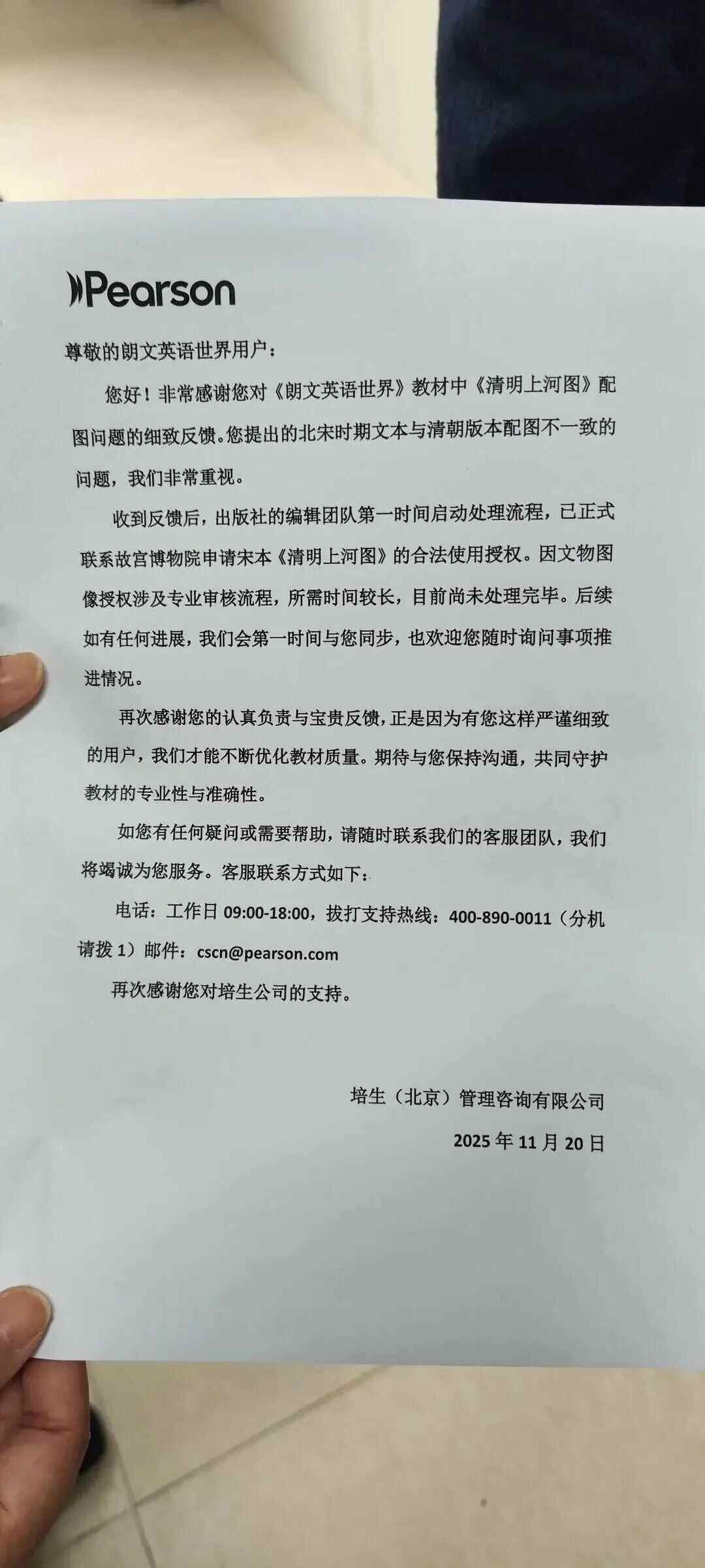 这位十岁的少年在预习《朗文英语世界》教材发现:课文讲述的是北宋时期的《清明上河图》,但所配插图却是清代版本,存在明显史实不符问题。经家长反馈至四川省语言文字教材处后,出版社迅速回应,已启动向故宫博物院申请宋代原版图像授权的流程。