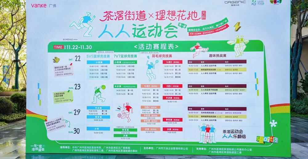 “人人运动会”由中共荔湾区委宣传部、荔湾区文广旅体局、茶滘街道党工委、茶滘街道办事处指导,茶滘街道公共服务办公室、团工委支持,万科理想花地主办。