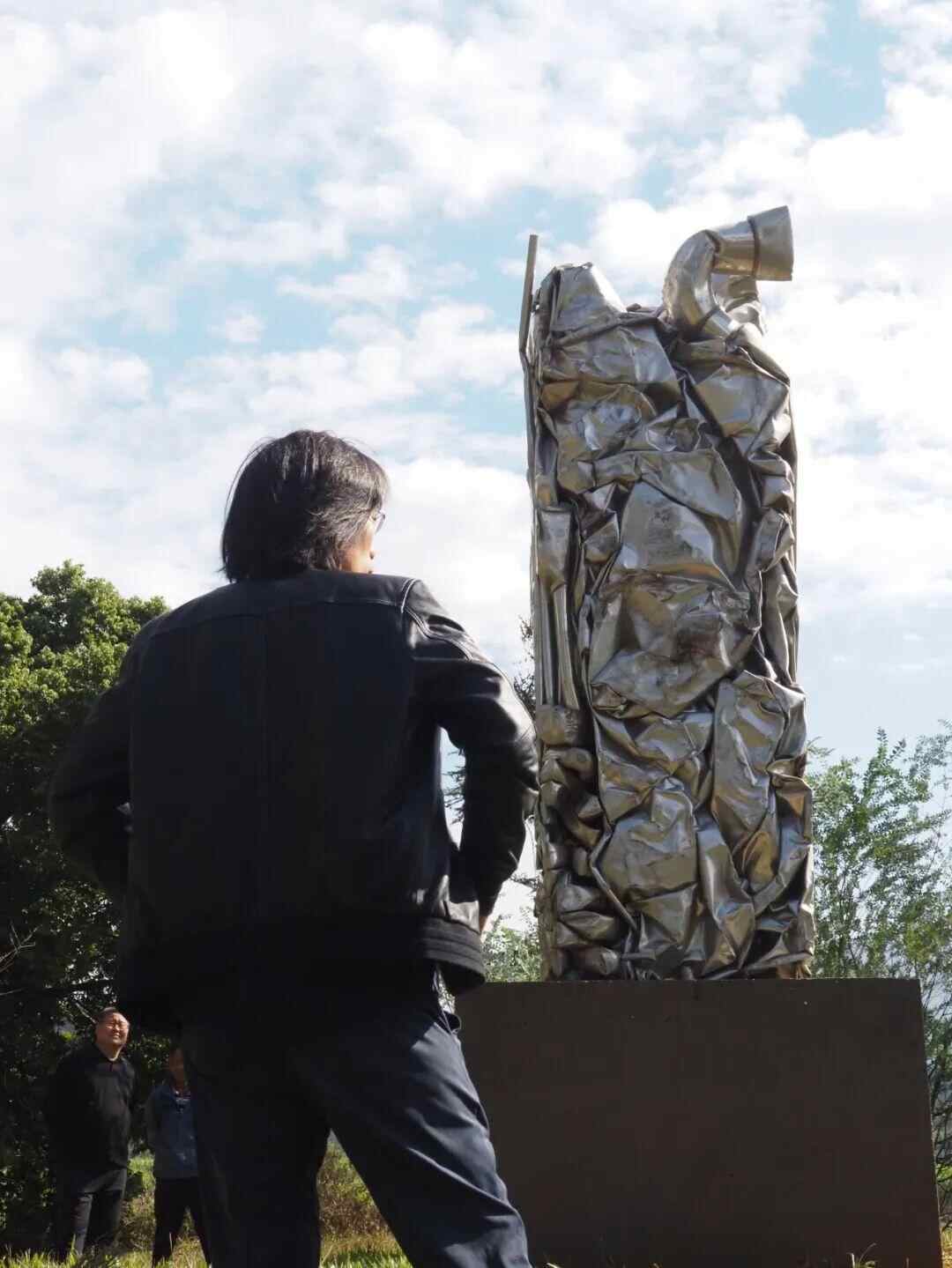 坤哥开起叉车,夹起巨大的不锈钢凝块。我骑电驴在前,他驾叉车随后,吭哧吭哧就到了定南村公园最高处。坤哥立起凝块,然后把它送到基座上面。阿聪、老余动手挪了挪位置。我说:对,就这样!突然,凝块喷发光芒,把周围的草坪、田园和大腊岭,全部照亮。——我的第二件雕塑作品,就此诞生。和吴德灏合作作品。来来回回绕了几圈,看各种褶皱,深觉其美。一时兴奋。接着,阿聪用钢筋条把凝块和基座上的钢筋焊接起来。火焰喷发。二十分钟后完工。一推,纹丝不动,再推,安如磐石,三推,满意而归。