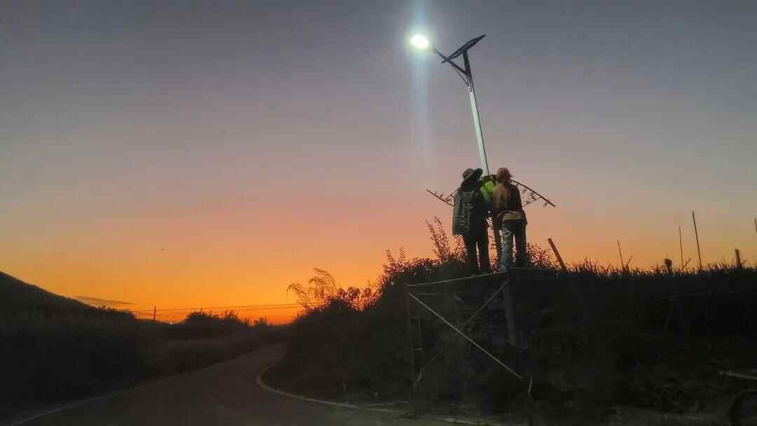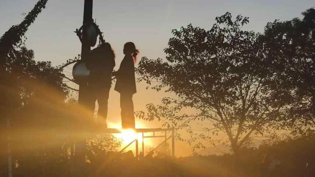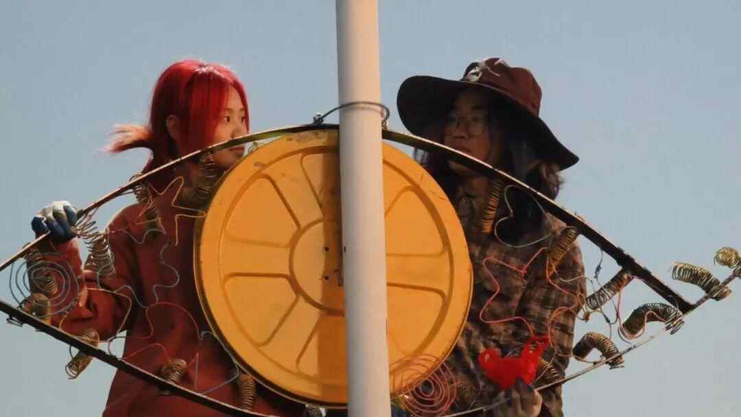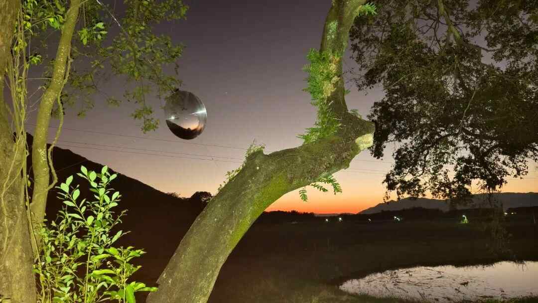 傍晚,陈德道来到定南村公园。前有一大片灯光升起来。那是静妍的作品。血色夕阳下,其光淡黄,有一种温馨、独立、清冷之美。旁边陈意、泳欣的作品正悬于树杈中间,像一只圆形的水滴,正缓缓坠落于大地,但永远将坠而未坠。