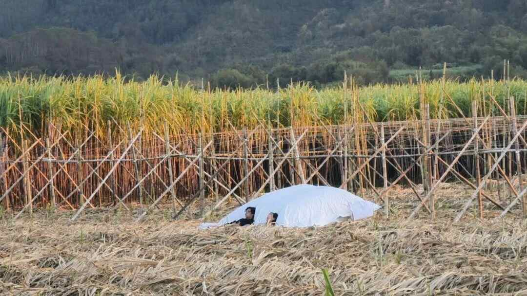 赶到甘蔗田时,立信、梓涌正躺他们制作的巨大枕头上。枕头比他们的身体要大十倍左右。赶紧请阙道华来航拍。