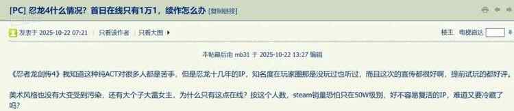 但在几个玩家社区里,倒是有一种声音是整齐划一的,大家纷纷诧异于:忍龙4怎么会这么小众,Steam最高同时在线才一万?