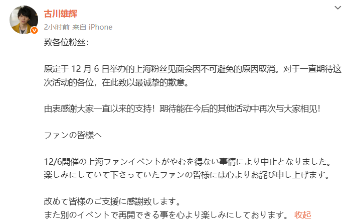 11月20日,日本演员古川雄辉在微博发文确定粉丝见面会取消,向大家致歉。其发文如下:
