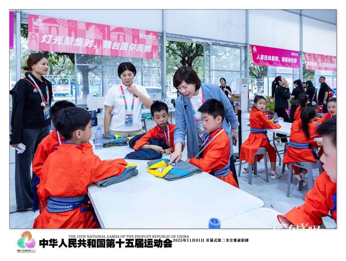 她举例:那些扮演活泼可爱吉祥物人偶的演员们,都是来自佛山黄飞鸿文武学校的10多岁的孩子,正值青春发育期,体力消耗大,消化快、吃得也多。“我们导演组在巡场时,总会特别留意这些小家伙。我会特意让后勤保障组的同事多准备些主食和烧鸭等加菜,确保孩子们能‘食得饱,食得好’。”黄沛凌用粤语轻松地说道,“对于这群离家的孩子来说,一句‘食饱未’,一份额外的点心,就能让他们感受到关怀,开心一整天,排练起来也更有劲头。”