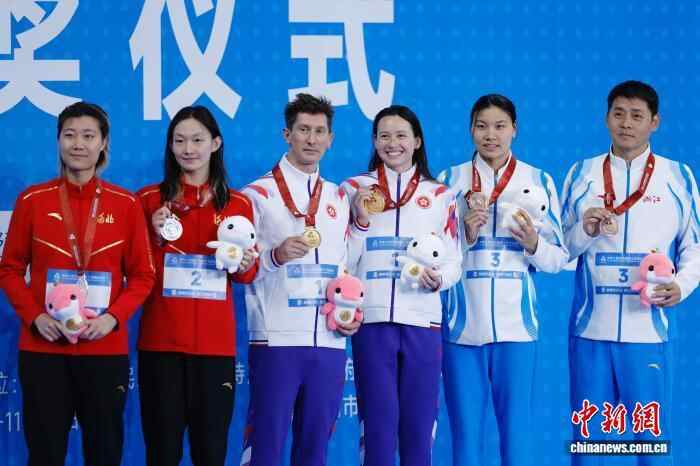 11月13日,第十五届全国运动会女子200米自由泳决赛在深圳大运中心游泳馆开赛,香港队何诗蓓(左四)夺得金牌,河北队李冰洁(左二)和浙江队柳雅欣(右二)分别获得银牌和铜牌。图为颁奖仪式。 中新社记者 韩海丹 摄
